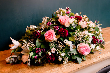Dessus de cercueils, bouquets de deuils, couronnes d’enterrement, paniers, gerbes à main, raquettes, coussins… À l’écoute de vos besoins, nous créons des compositions naturelles, travaillées, élégantes et délicates, pour vous aider à offrir un dernier hommage lors de l’enterrement des personnes disparues.